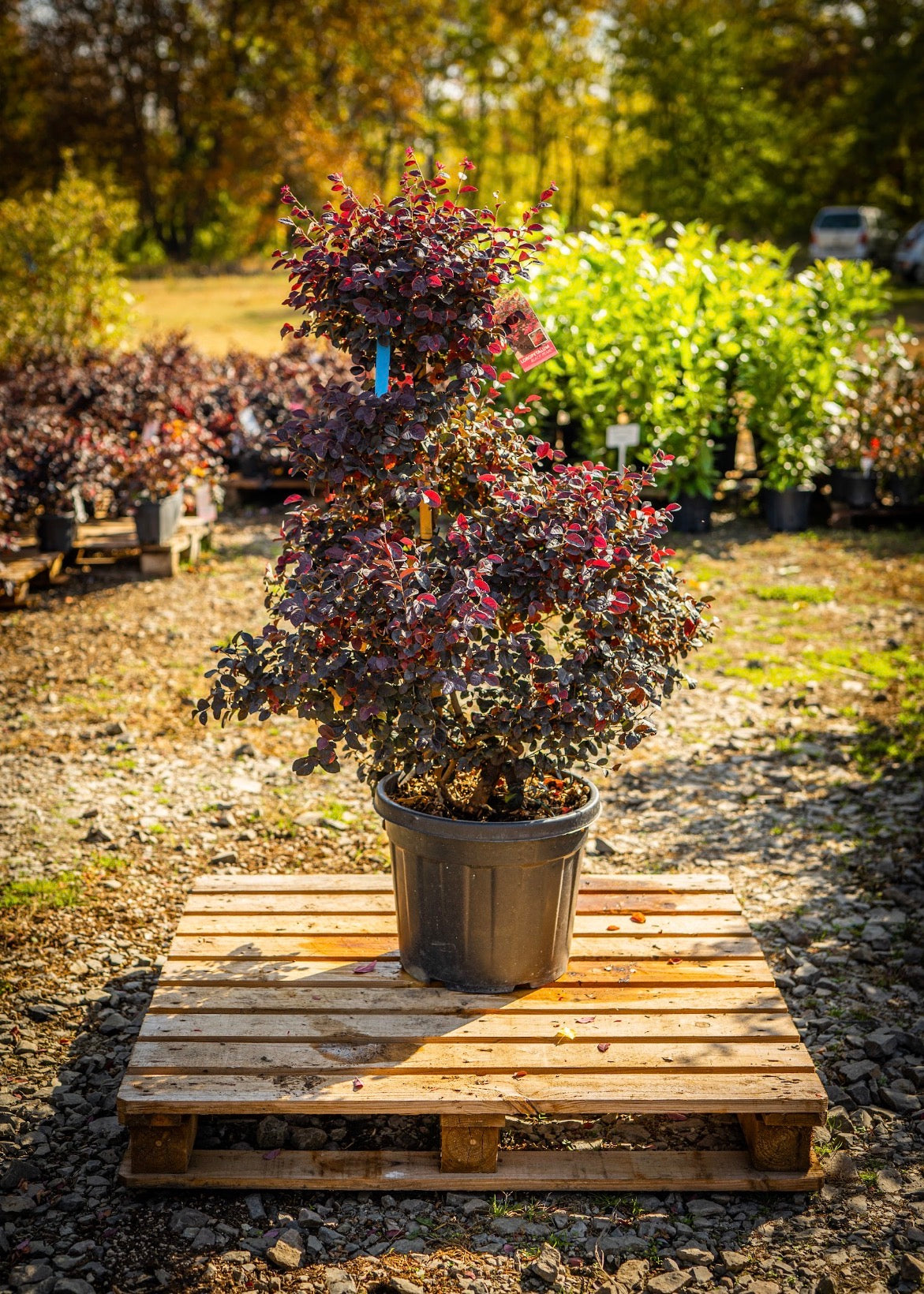 A “Nagy bokros gömb” egy formára formált díszcserje sűrű, lekerekített lombozattal és élénk színnel. Ideális konténerbe, bejáratokhoz vagy formális kertekbe, minimális gondozással struktúrát és szezonális bájt kölcsönöz.