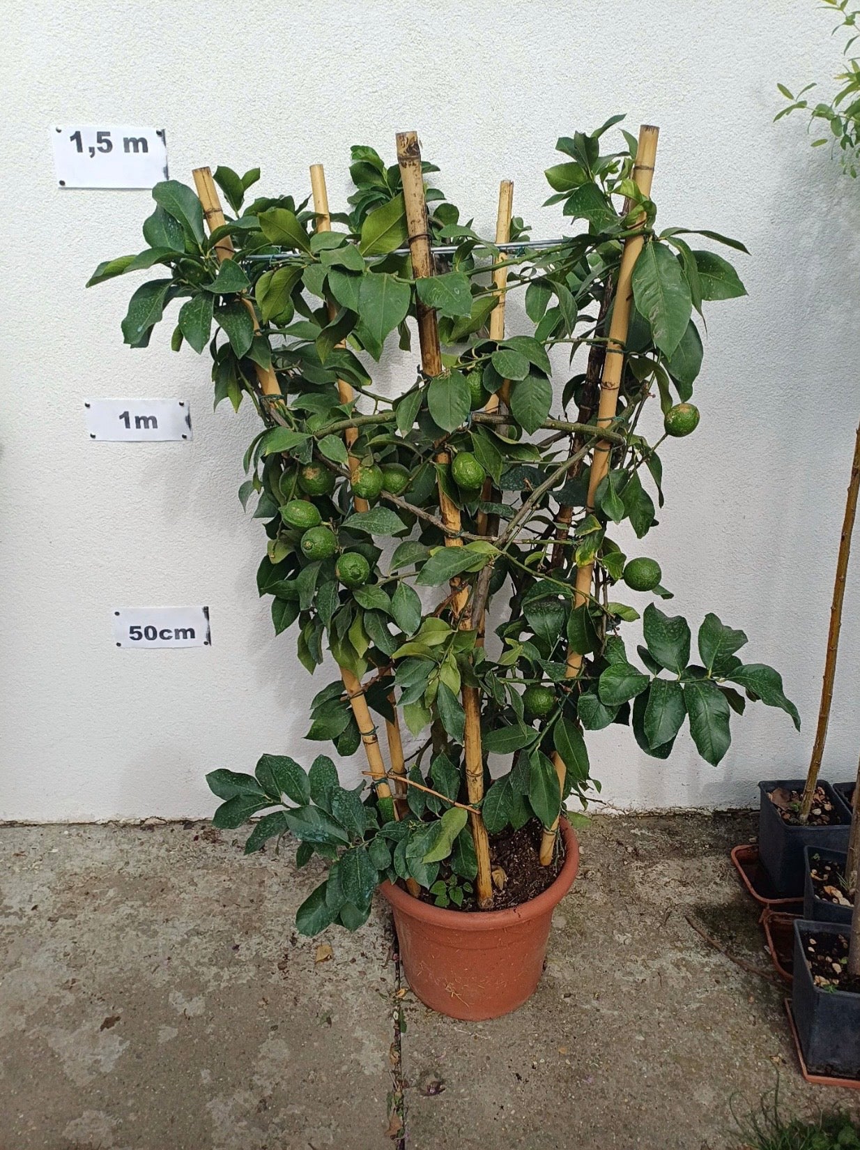 "Citrom Fonott Közepes"egy körülbelül 1,5 méter magas, fonott szárakkal és élénkzöld lombozattal rendelkező, strukturált citrusféle. Elegáns formája és látható termései tökéletes választássá teszik kertekbe, teraszokra vagy dekoratív terekbe.