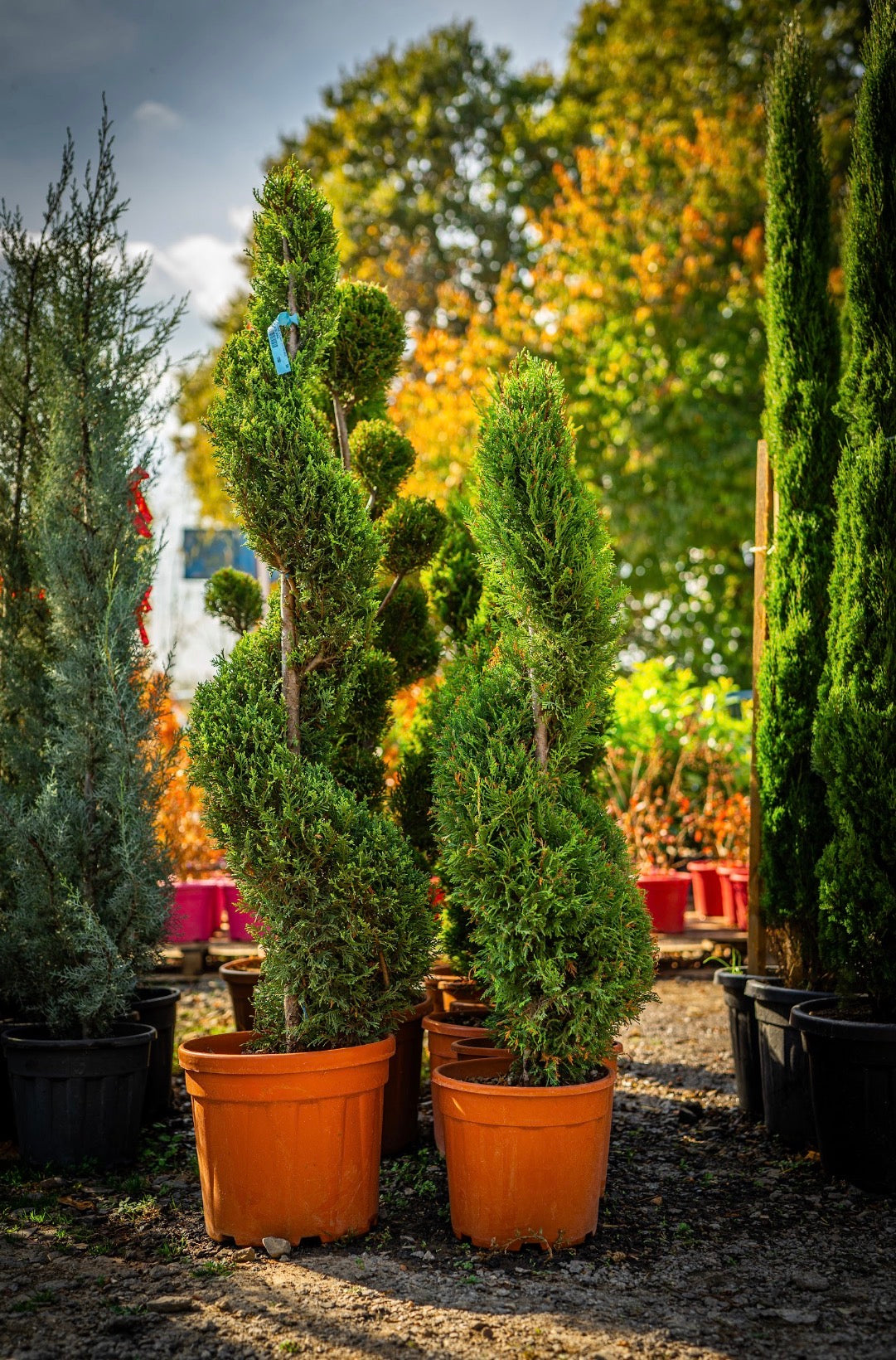 "Leylandi cipruss spiràl"a gyorsan növő örökzöld *Cupressus × leylandii* feltűnő formája, elegáns, csavart formákra metszve. Formális kertekbe, bejáratokhoz vagy konténeres dísznövényekbe ideális, egész évben zöld növényzetet, építészeti stílust és minimális karbantartást igényel, miután megtelepedett.