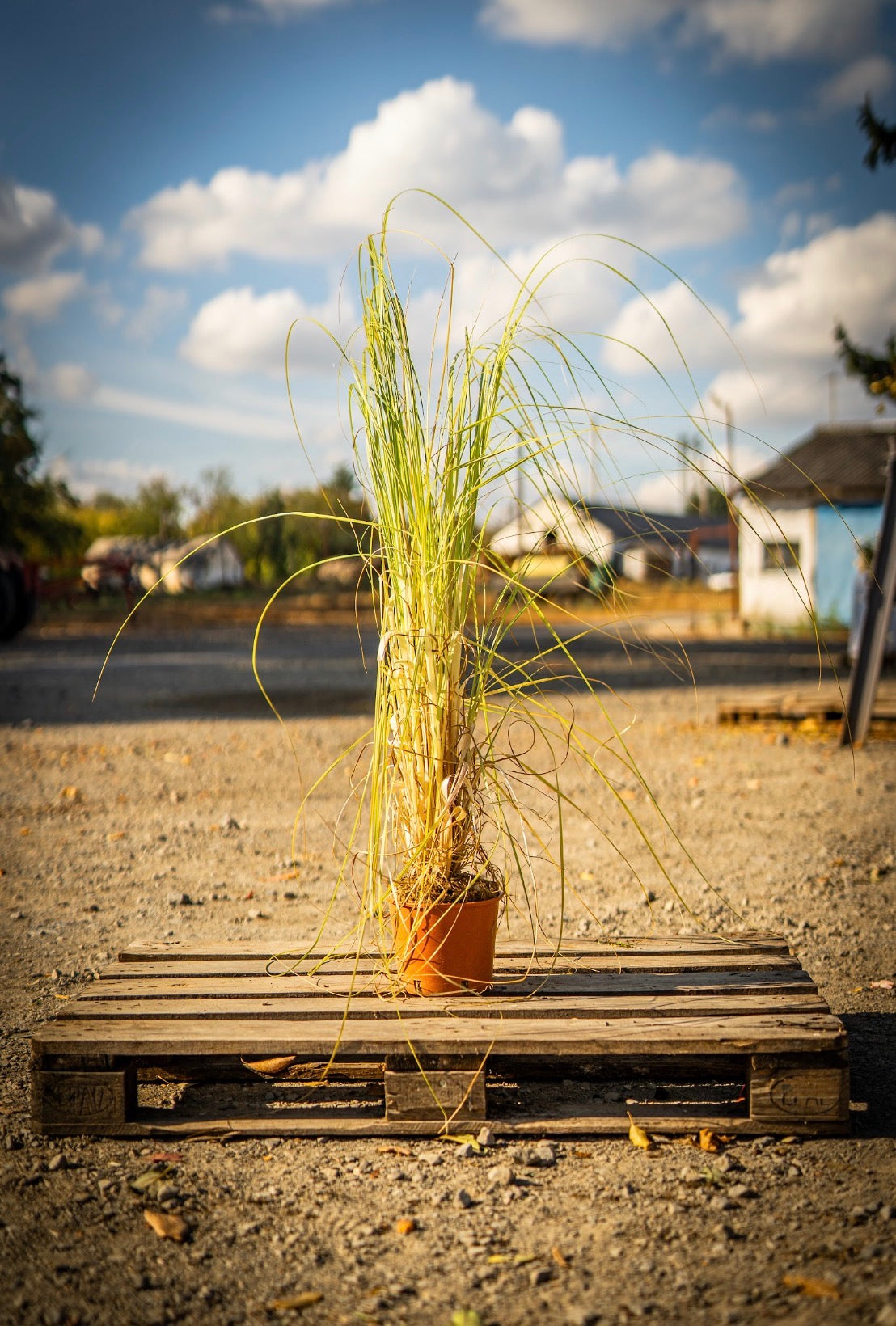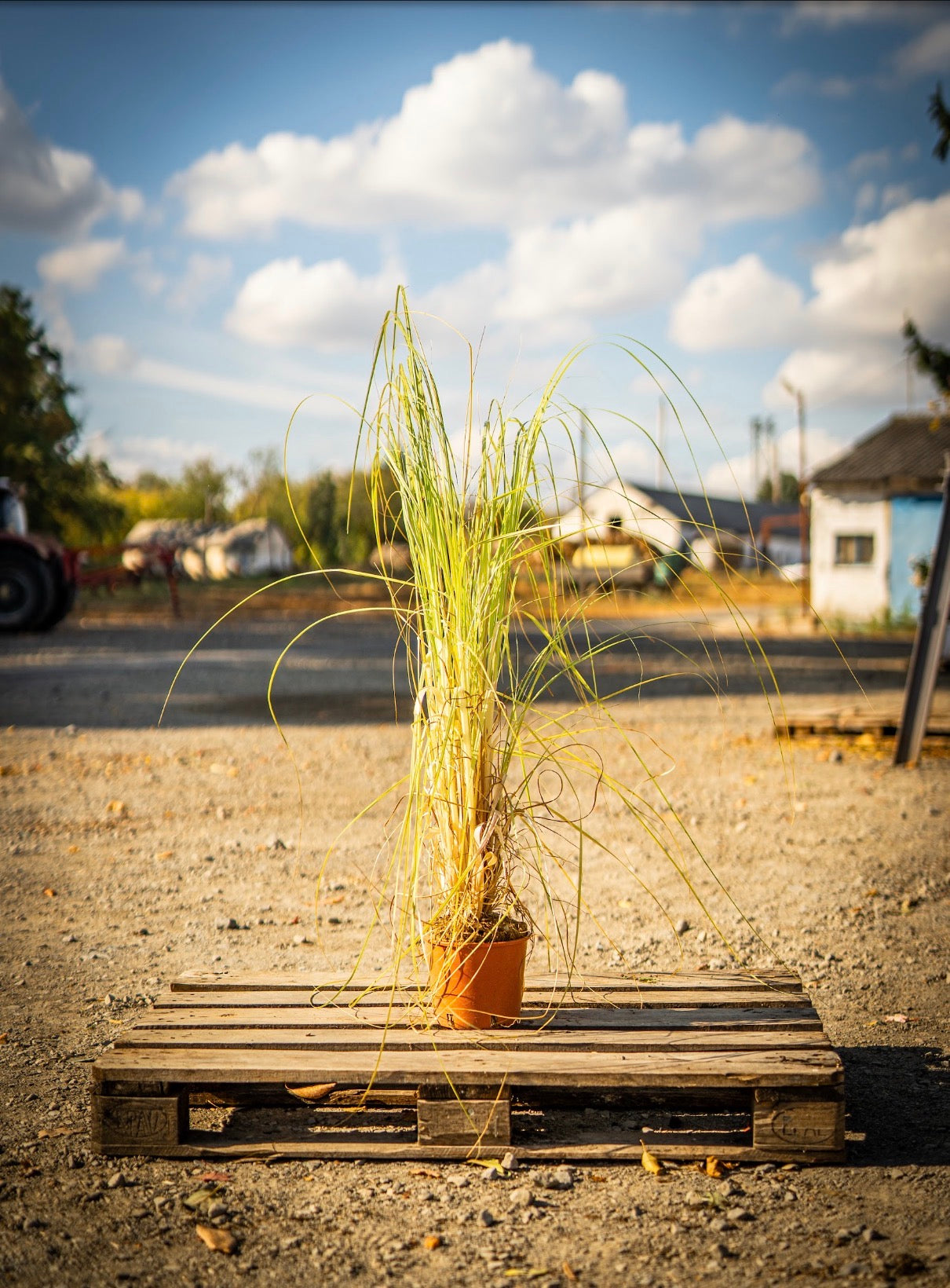 "Pampafű" egy látványos, díszítő értékű fűféle, hosszú, íves levelekkel és magas, tollszerű virágzatokkal. Kiváló választás szoliterként vagy háttérnövényként, mivel természetes eleganciát és mozgást visz a kertbe, miközben jól tűri a szárazságot és a napsütést.