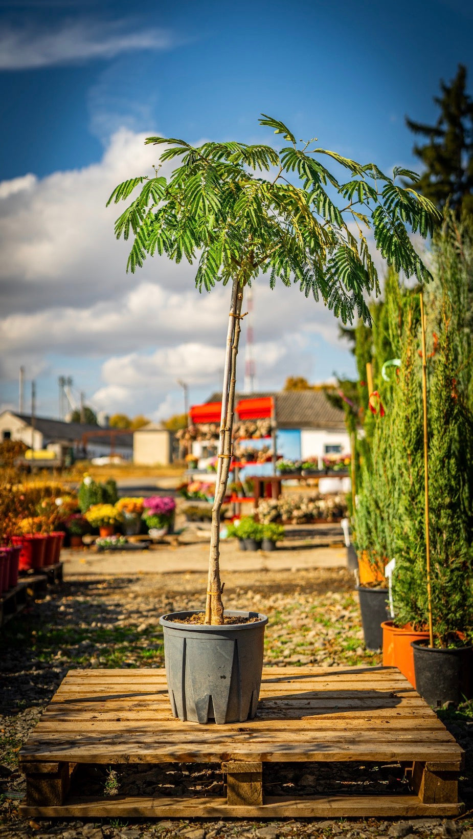 "Selyemakác evey's pride" egy különleges megjelenésű díszfa, finoman szeldelt, világoszöld lombbal és légies, rózsaszín virágfürtökkel. Modern és mediterrán kertekbe ajánlott, ez a napfénykedvelő, gyorsan növő fajta a kedvence.