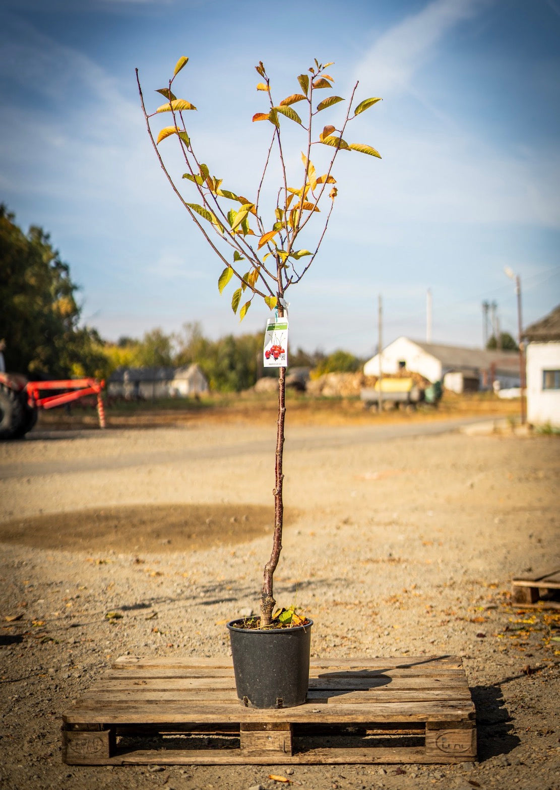 "Meggy"egy kompakt gyümölcsfa, amely fanyar, rubinvörös cseresznyéiről és szezonális lombozatáról ismert. Kertekbe és gyümölcsösökbe ideális, tavaszi virágzásával és ízletes termésével tűnik ki – tökéletes lekvárokhoz, pitékhez és lekvárokhoz.