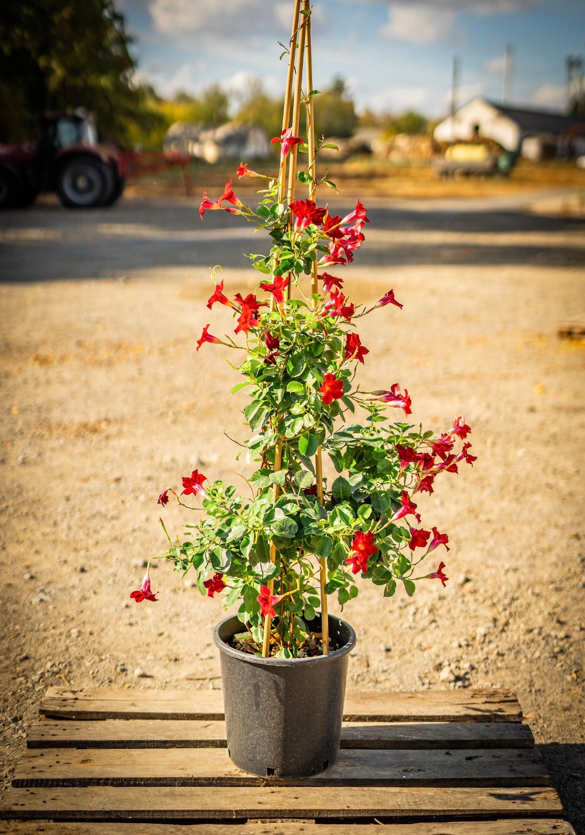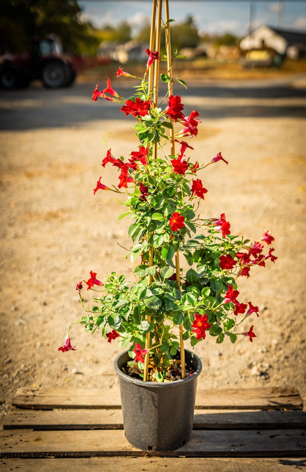 "Tölcsérjázmin piros" egy lenyűgöző, futónövényként is nevelhető dísznövény, amely élénk, tölcsér alakú piros virágaival hosszan virágzik a meleg időszakban. Erőteljes színe és gazdag virágzása miatt ideális pergolákra, rácsokra vagy balkonládákba, mediterrán hangulatot és vibráló energiát visz a kertbe vagy teraszra.