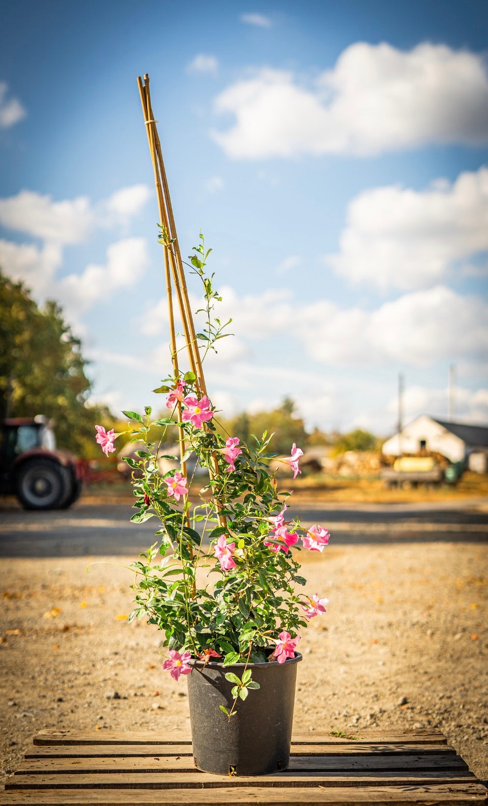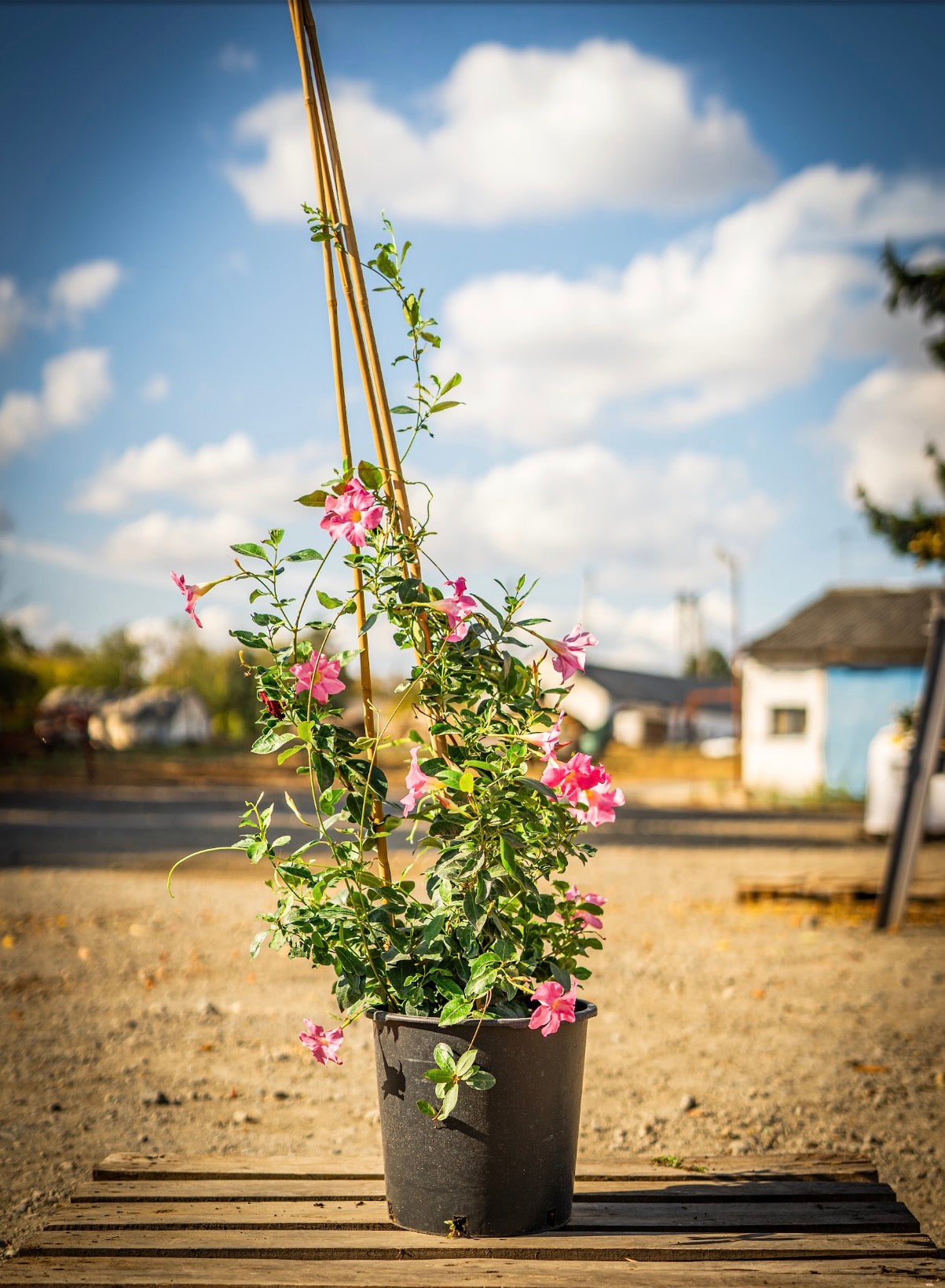 "Tölcsérjázmin rózsaszín" egy látványos, futónövényként is nevelhető dísznövény, amely tölcsér alakú, élénk rózsaszín virágaival hosszan virágzik a meleg hónapokban. Ideális pergolákra, rácsokra vagy balkonládákba, mivel gyors növekedésével és gazdag virágzásával mediterrán hangulatot teremt.
